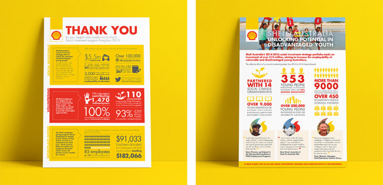 As a Preferred Supplier to Shell Australia, we work regularly with many members of Shell staff throughout different divisions. This involves both print and digital in a wide range of media including flyers, brochures, safety guides, posters, large format signage, press ads, in-office screen displays, digital interactive PDFs, e-newsletters and web banners. An example of one particular range is for Shell’s Prelude FLNG project that has included all of the previously detailed material.